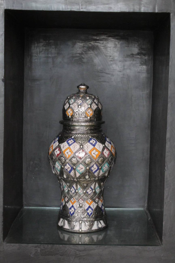 ceramic footed vase from Fez. Moorish style handcrafted vase adorned wif fine filigree silver nickel work, Antique Hispano Moresque design vase on ceramic bleu de Fez urn wif some organic pastel colors.